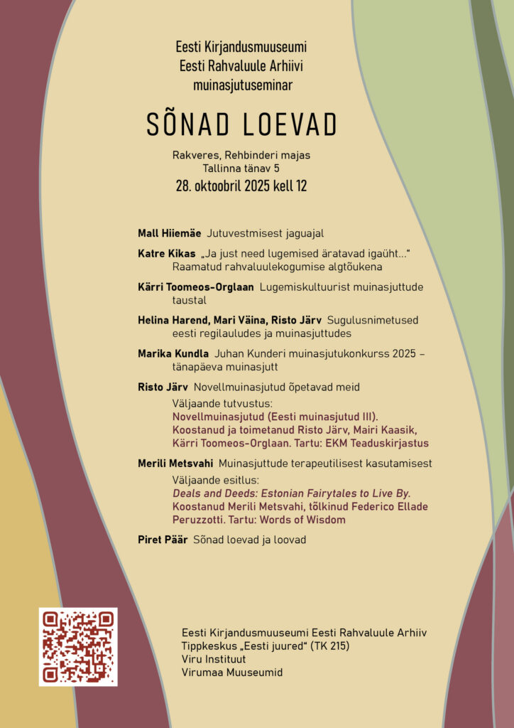 Simunapäeval ehk teisipäeval, 28. oktoobril 2025, algusega kell 12.00 toimub Rehbinderi majas Eesti Rahvaluule Arhiivi muinasjutuseminar “Sõnad loevad”.